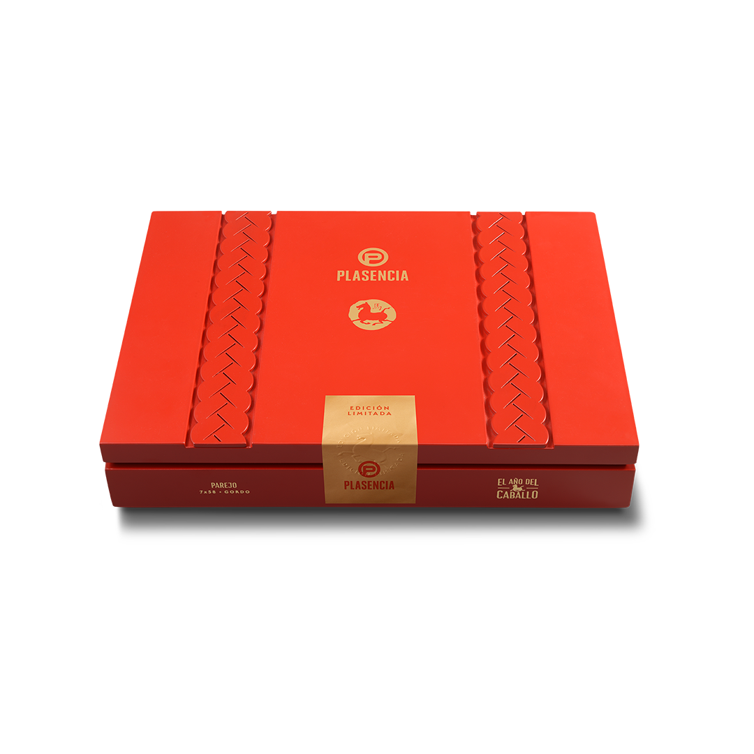 With over 160 years of family legacy , Plasencia reaffirms its mastery in crafting premium cigars. Each El Año del Caballo cigar is distinguished by its Parejo Gordo vitola (7 x 58) and its exclusive hand-braided cap , a work of art requiring the precision and dedication of three master cigar rollers.