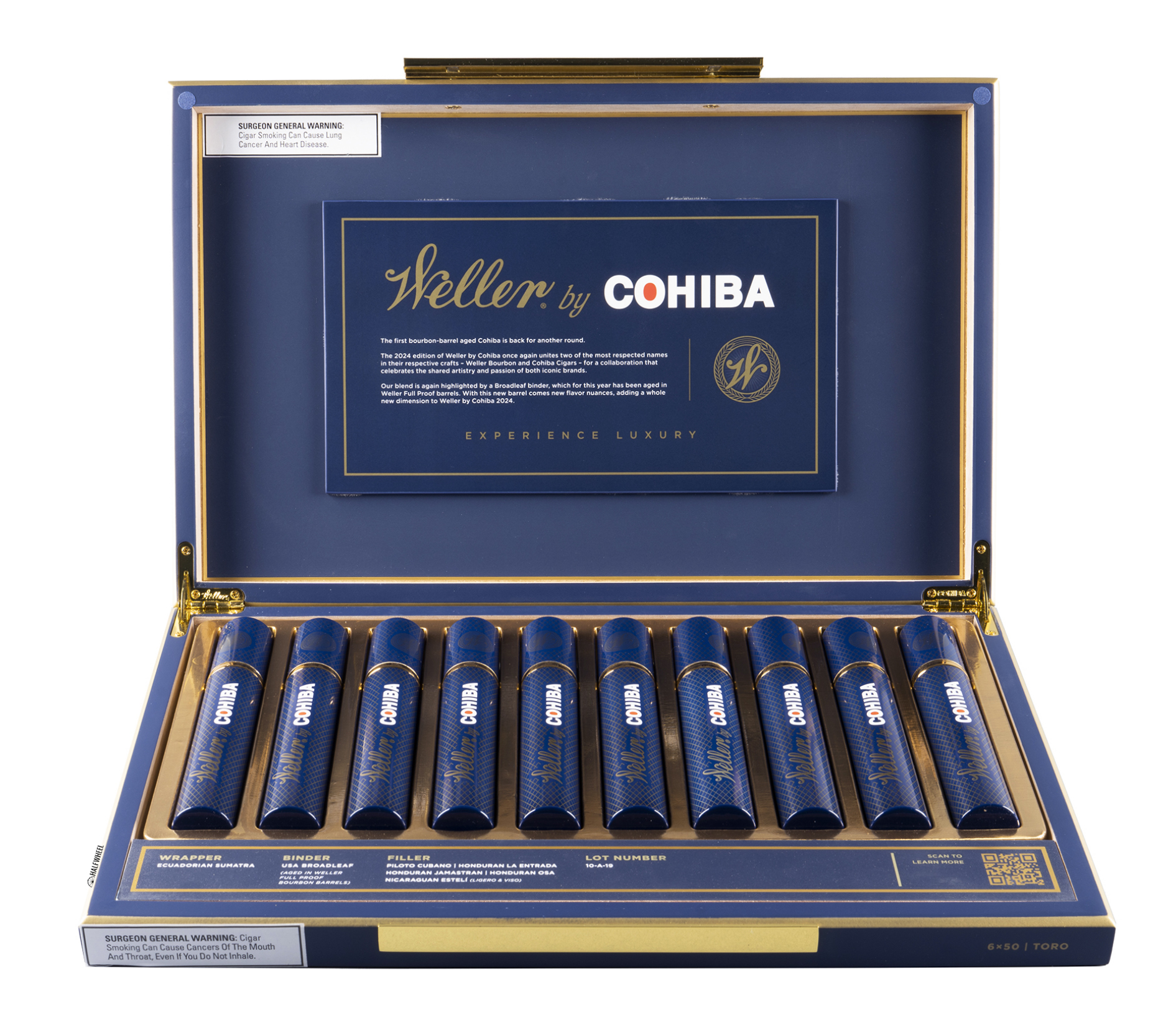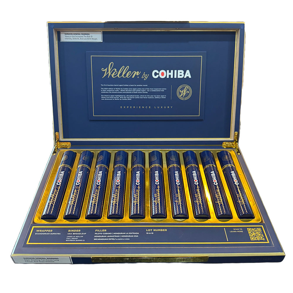 This medium bodied cigar delivers delectable notes of honey, spice, cedar, and bourbon. Its muscular, dark Ecuadorian Sumatra wrapper sheathes a USA Broadleaf binder that was aged in barrels that contained Weller Full Proof bourbon. This exquisite binder houses premium filler leaves from the Dominican Republic, Nicaragua, and Honduras. Once rolled, each cigar is nested in an aluminum tube to protect its wrapper and preserve its delicious flavors and aroma. Pairing suggestions: Bourbon, Single Malt Whisky, or Single Malt Scotch. The Weller by Cohiba 2024 Limited Edition cigar is a box worthy smoke that will appeal to cigar aficionados looking to elevate their smoking portfolio. The cigars are expertly hand crafted in the Dominican Republic.